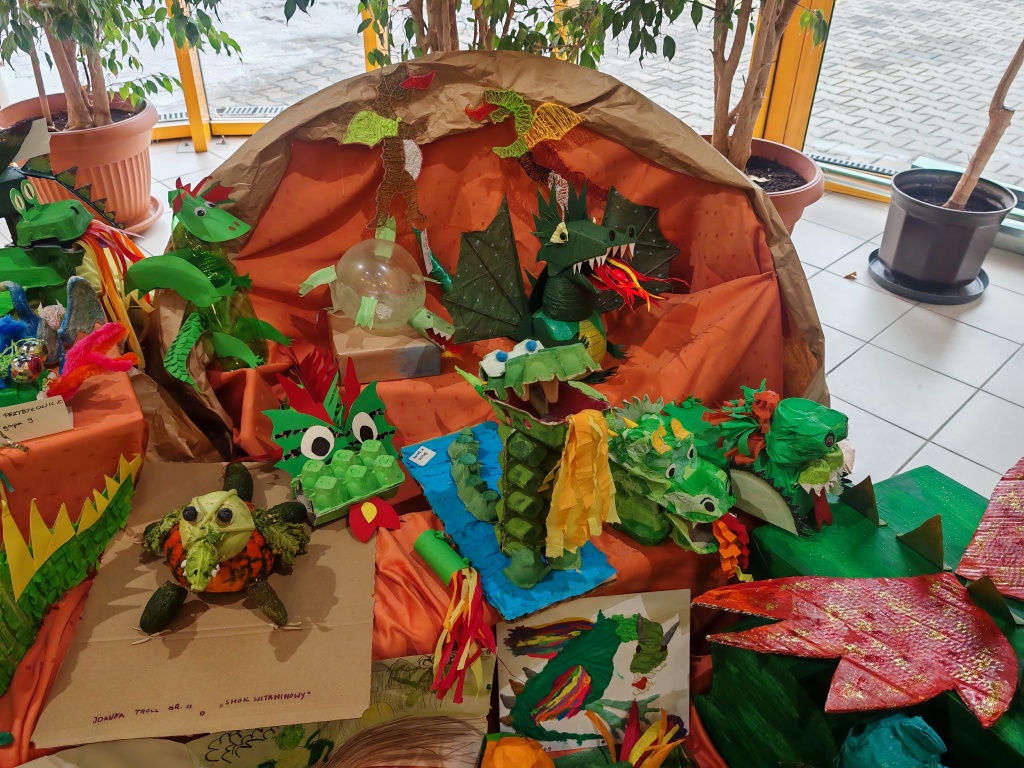 Szczególnie cieszyła bogata paleta technik plastycznych. Dzieci wykorzystały nie tylko tradycyjne kredki i farby, ale także bibułę, plastelinę, brokat, a nawet elementy materiałowe i surowce wtórne (np. rolki po papierze, kawałki kartonów). Dzięki temu Smoki były nie tylko płaskie, ale przybierały formy przestrzenne, co świadczy o ogromnej wyobraźni twórców.